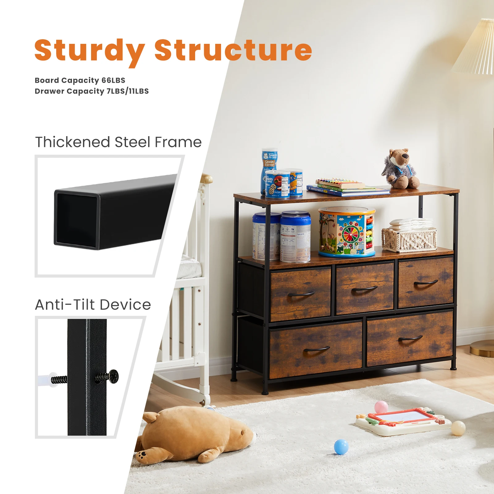 【Safe & Sturdy】 This chest of drawers uses a thickened metal frame to keep the fabric dresser stable, with 4 adjustable feets to protect your floor from scratches, and you can adjust the balance of the dresser in small areas. Using the anti-tilt device, an auxiliary feature can be added if the dresser is attached to the wall, as it prevents falling caused by uneven floors or children climbing.