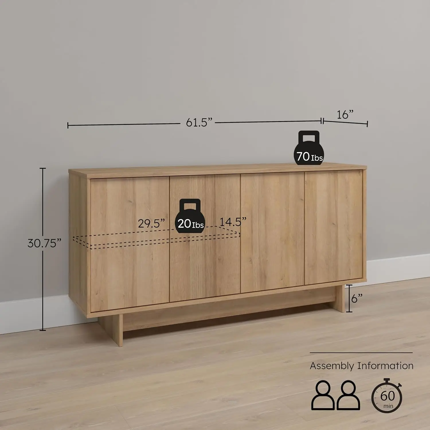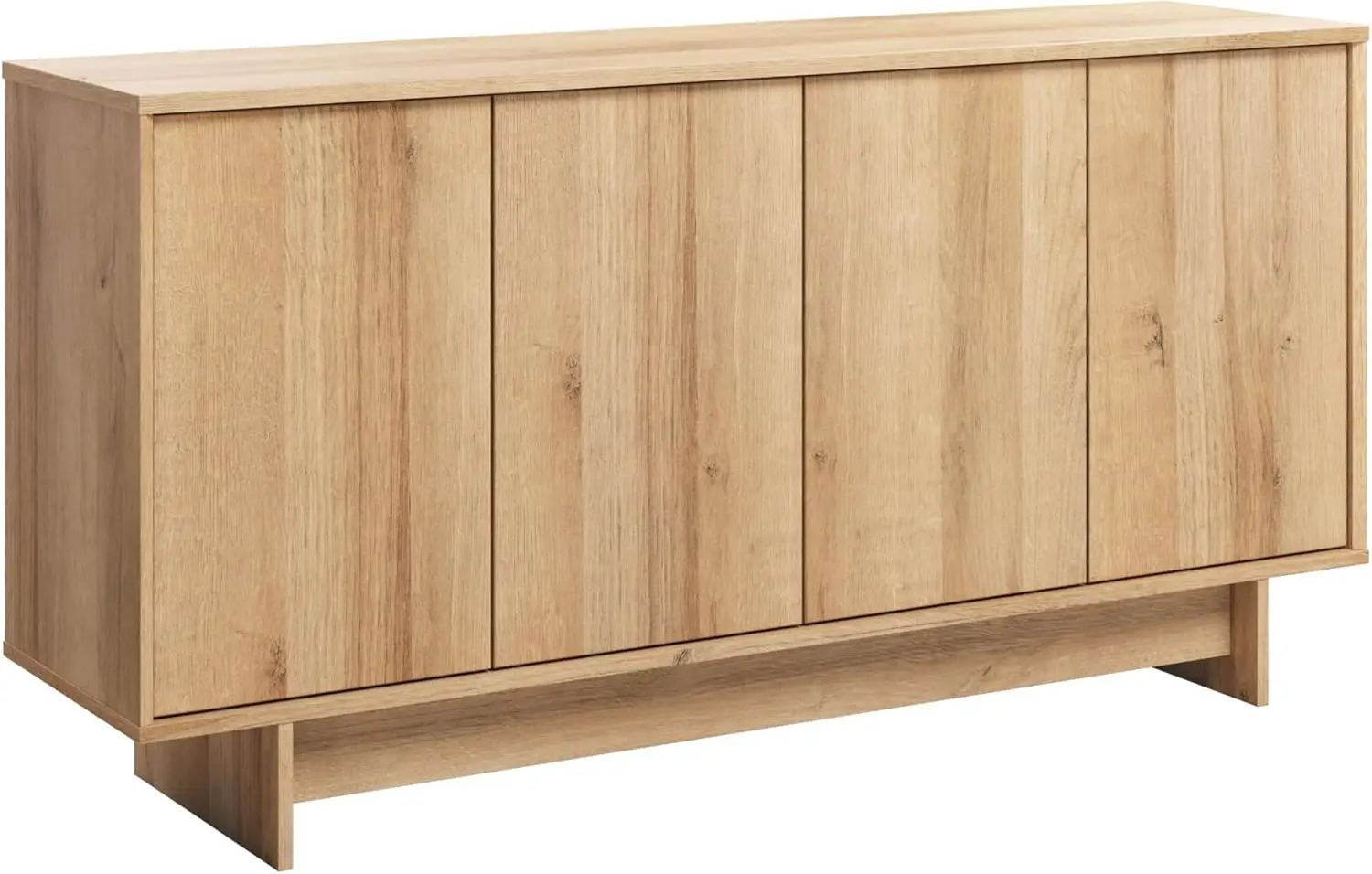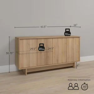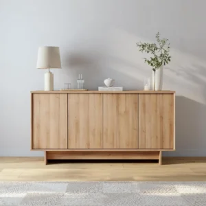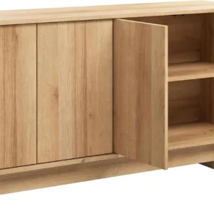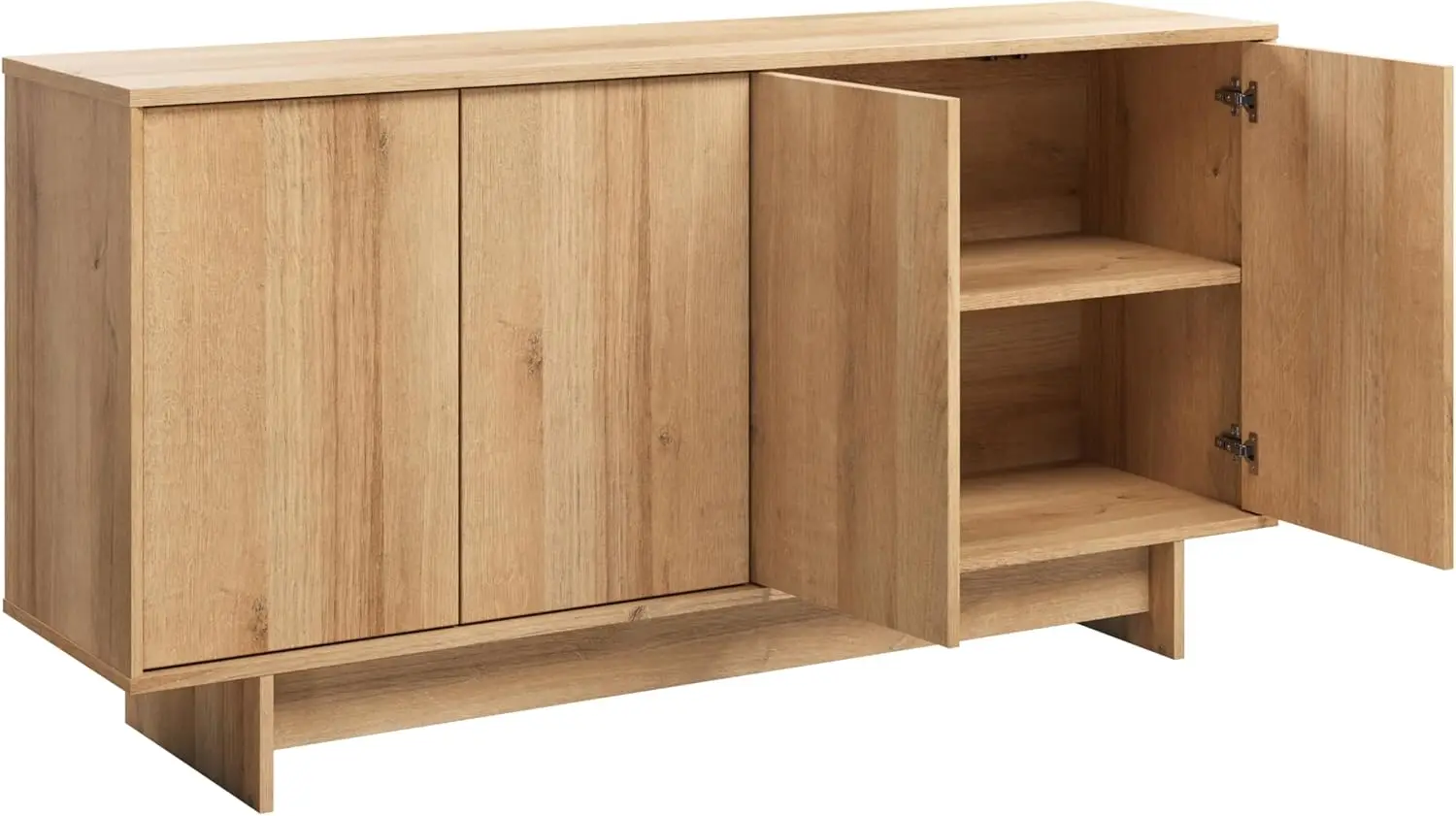 Natural Oak Sideboard offers a sophisticated solution to your storage and display needs, combining minimalist Scandinavian furniture design with versatile functionality. Crafted in a natural oak finish, this sideboard seamlessly adapts to any space, serving as an elegant addition in entryways, dining rooms, living rooms, or even as a stylish TV console cabinet or buffet cabinet with storage. Its balanced and minimalist style creates a warm aesthetic that enhances both modern and traditional interiors, making it a perfect piece for any home decor. With two adjustable shelves, the Finnley Sideboard provides customizable storage options for various household essentials. The inside shelving can be tailored to store everything from serving dishes and entertainment essentials to books or personal items. For added convenience, the sideboard features innovative six-way adjustable Euro hinges, ensuring effortless opening and closing. Each cabinet door operates with a hardware-free push latch system, enhancing the cabinet’s sleek look while allowing for a smooth, intuitive experience. This versatile credenza storage cabinet can also function as a side board or a buffet storage cabinet, fitting perfectly into any room. Designed for easy assembly and durable performance, this accent cabinet is crafted from high-quality materials, ensuring long-lasting quality. The Finnley Sideboard Cabinet is both functional and stylish, offering concealed storage while maintaining an airy, uncluttered feel. Its natural oak finish adds a touch of warmth and elegance to any room, effortlessly blending into diverse decor styles. Whether you’re looking to streamline your entryway cabinet or create a chic focal point in your dining room, the Finnley Sideboard is a versatile storage solution that combines beauty with practicality, making it an ideal choice among buffets & sideboards and living room cabinets. Perfect for anyone seeking a buffet cabinet or an accent piece, this credenza sideboard buffet cabinet enhances your home’s functionality and style.